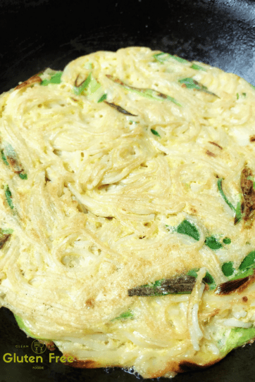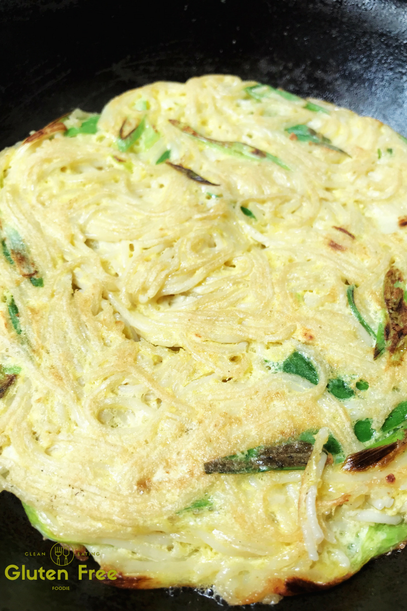 - Add the cooked gluten-free spaghetti, some garlic powder, dried onion flakes, green onions and a pinch of sea salt in to the scrambled egg.